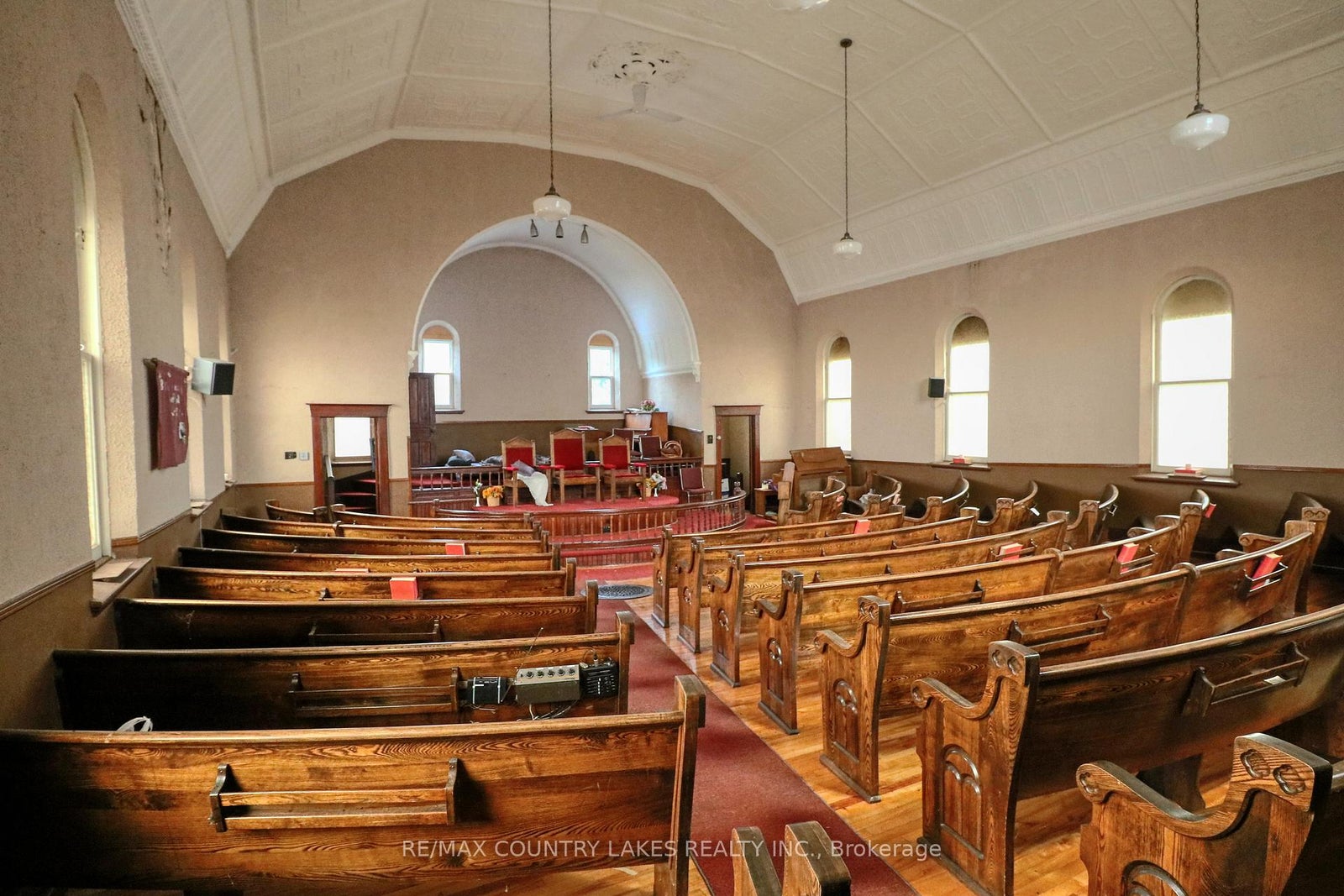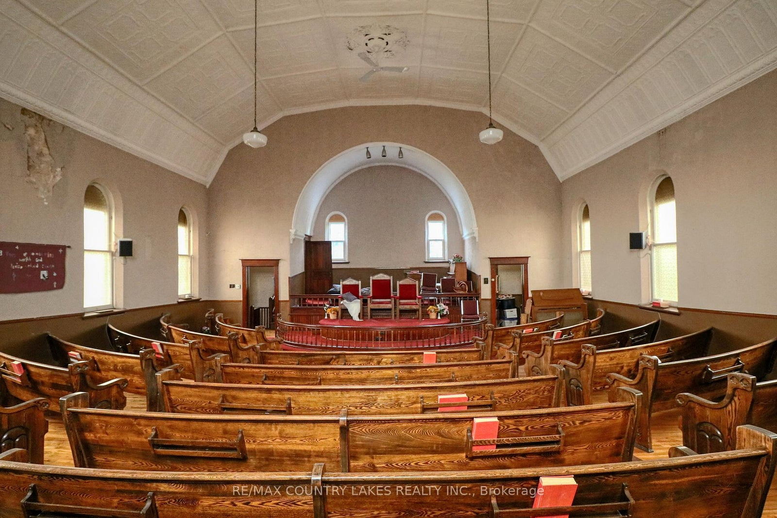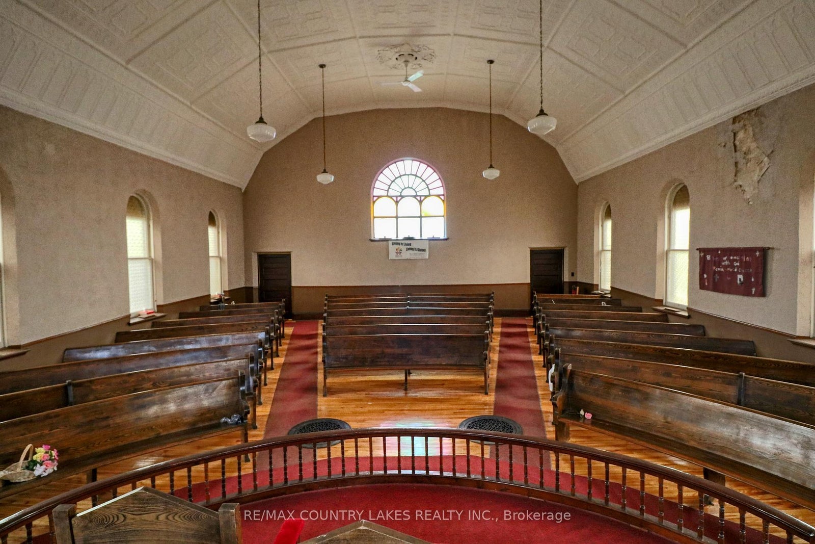 Opportunities like this don't come along often. This solid all-brick former church with a durable steel roof offers incredible bones and endless potential for the right buyer with vision. Set on a generous 218' x 99' lot with ample parking and a drilled well, the property provides approximately 3550 sq ft of finished above-grade space ready to be reimagined. Step inside to a truly unique Great Room featuring soaring cathedral ceilings, original pews, a front stage, and impressive ceiling height-ideal for adding a mezzanine level to create additional bedrooms or living space. A double stairwell leads to the upper level, opening the door for a variety of layout possibilities. The finished lower level adds even more flexibility with two kitchens, space for at least two bedrooms (with potential for more), a large recreation area, furnace room, storage, and both a 2-piece and 3-piece bath (with shower to be completed). Character-rich details like original stained glass windows create a stunning ambiance-especially when lit by the moon-while the peaceful setting offers quiet country nights and picturesque farm field views. Located just 15 minutes to Lindsay for all major shopping and only 5 minutes to Woodville for small-town essentials, this is a rare chance to enter the market at an affordable price with a property you can live in while transforming it into something truly special.